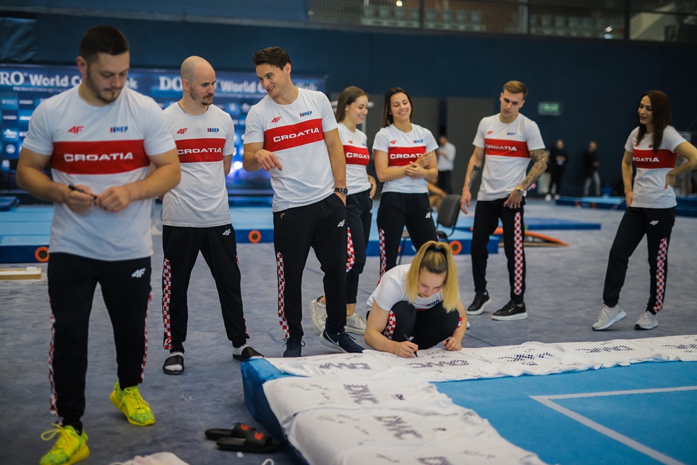 The following Croatian national team members took part in the press conference held on the occasion of the World Cup in gymnastics: Aurel Benović, Tin Srbić, Filip Ude, Jakov Vlahek, Marko Jovičić, Tijana Korent, Christina Zwicker, Tina Zelčić and Sara Šulekić.